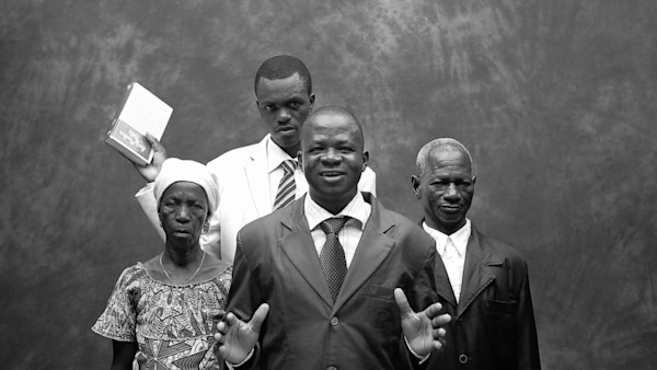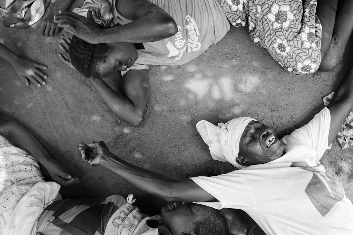 Pastor Lare Damitote Bertrand prays over Lare B?agoa, who is living with a mental health problem and is usually chained to a tree inside the grounds of The Pentecostal Church of Bokiccenag. His mother brought him to the church to have him healed.